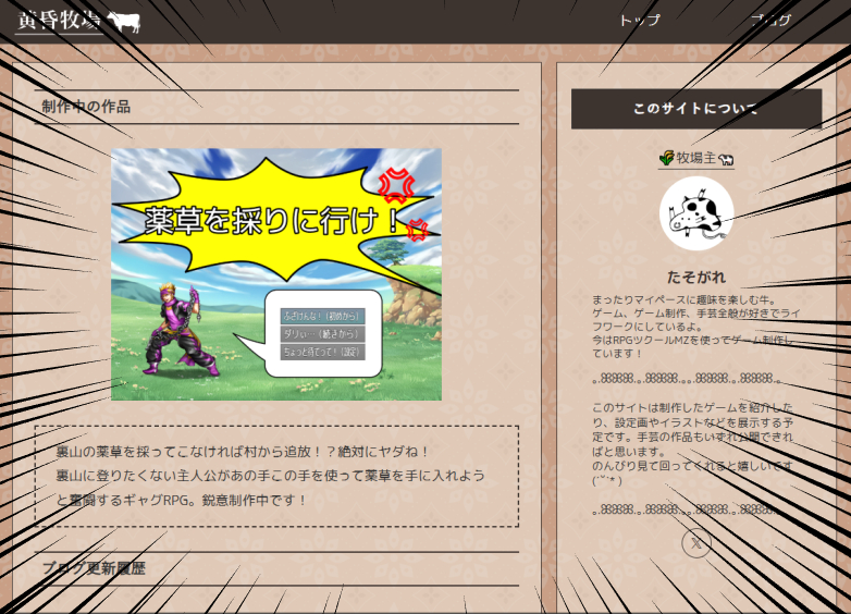 ゲーム紹介ページは今制作している「薬草を採りに行け!」が完成したら、過去作品と合わせて作ろうかなと予定しています。